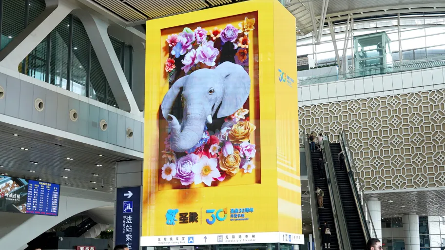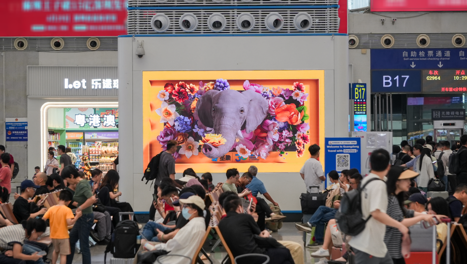 不同于商圈的“巨幕奇觀”,高鐵場(chǎng)景下則更加注重“即時(shí)互動(dòng)效果”與沉浸式觀感體驗(yàn)。通過(guò)兆訊高清刷屏媒體,憨態(tài)可掬的小象擷花贈(zèng)予往來(lái)旅客,“人與自然”間溫馨和諧的一幕自然融入高鐵場(chǎng)景,引領(lǐng)旅客邂逅時(shí)空奇遇,打造出與巨幕LED截然不同的近距離互動(dòng)體驗(yàn)和人屏互動(dòng)性。